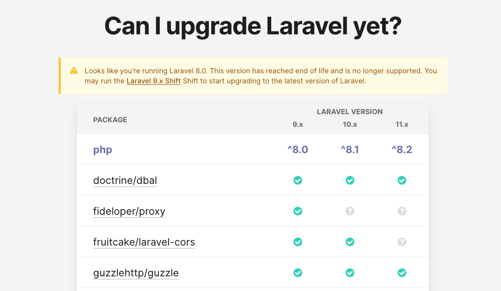 Laravel Shift now has a “Can I upgrade Laravel yet?” page where you paste in your composer.json file and it tells you if you’re able to upgrade, and if not, which dependencies aren’t compatible with the target framework version yet.