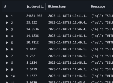 This allowed me to quickly find the slow running queries from JSON data in the log.