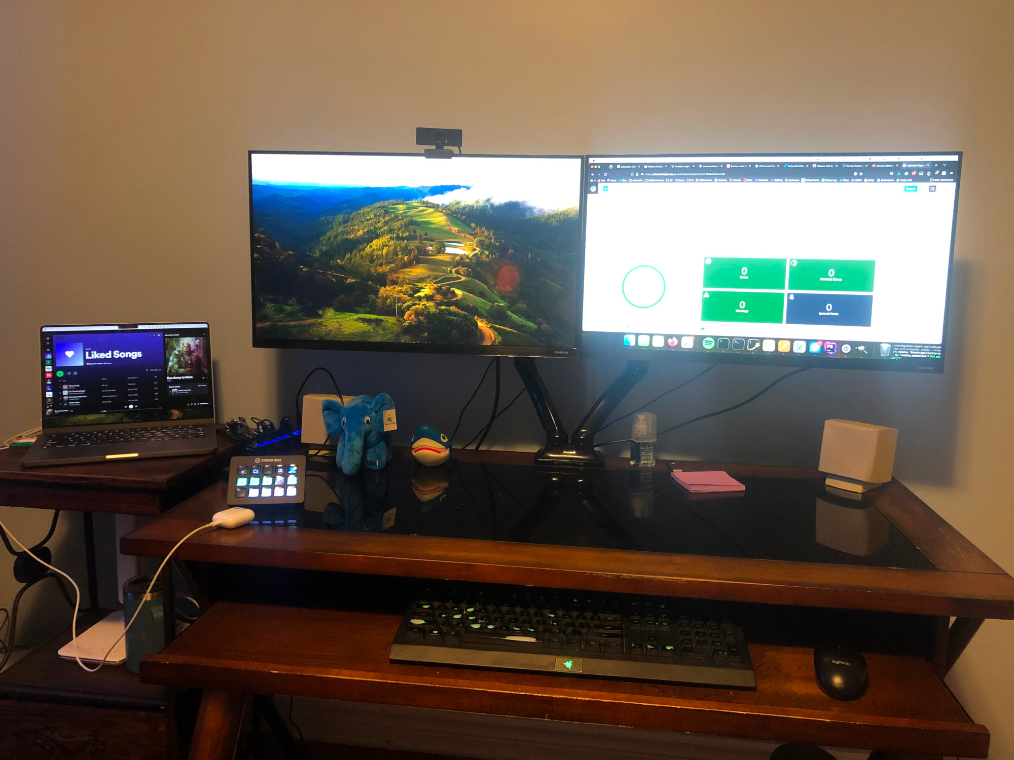 - Dual Samsung 24″ Monitors on swivel mounts for horizontal/vertical positioning